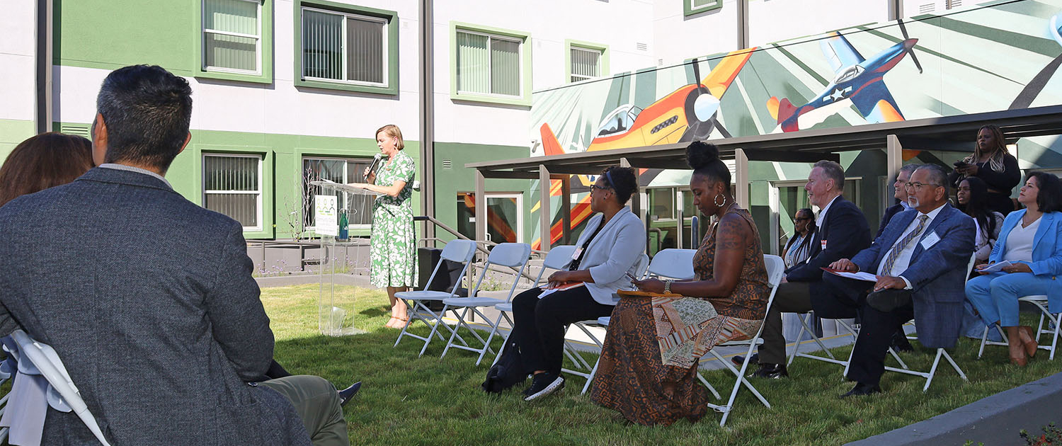 Named in honor of the Tuskegee Airmen, the pioneering African American pilots of World War II, the building features murals throughout the property celebrating their legacy of courage and perseverance. Red Tail Crossing also represents a major milestone as the first development built under California’s AB 721, legislation preventing discriminatory covenants from blocking affordable housing. The project site was previously subject to a restrictive covenant dating back to the 1940s that prohibited multifamily housing and excluded Jews and people of color.
